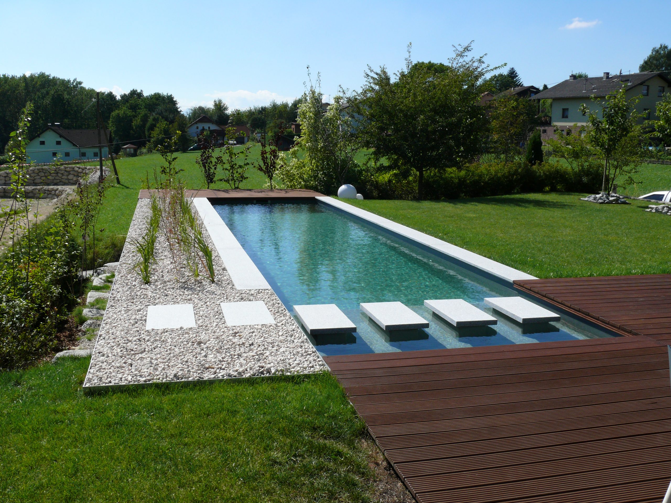 Hochwertiger Naturpool mit intelligenter Steuerung und vollautomatischer Wasserpflege.